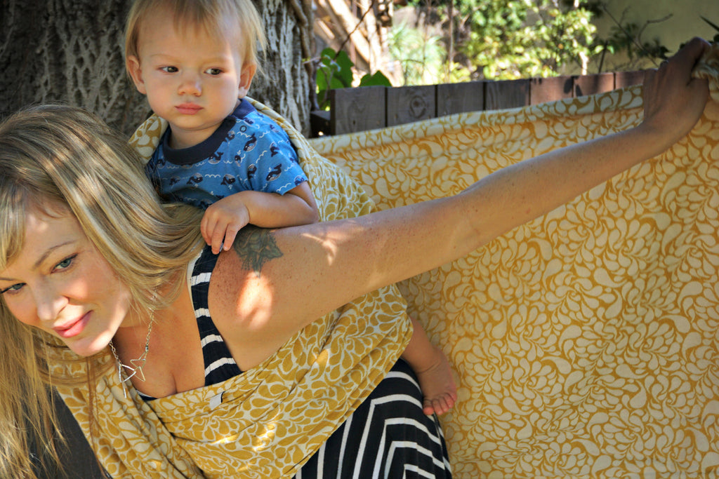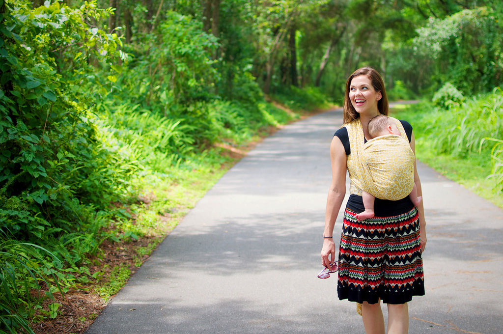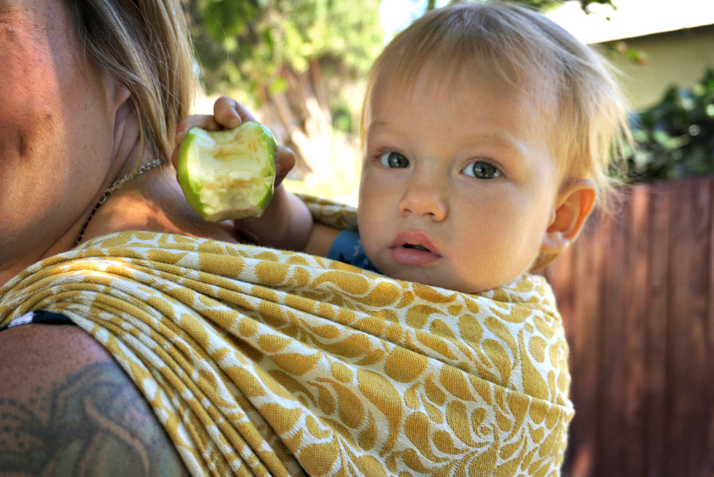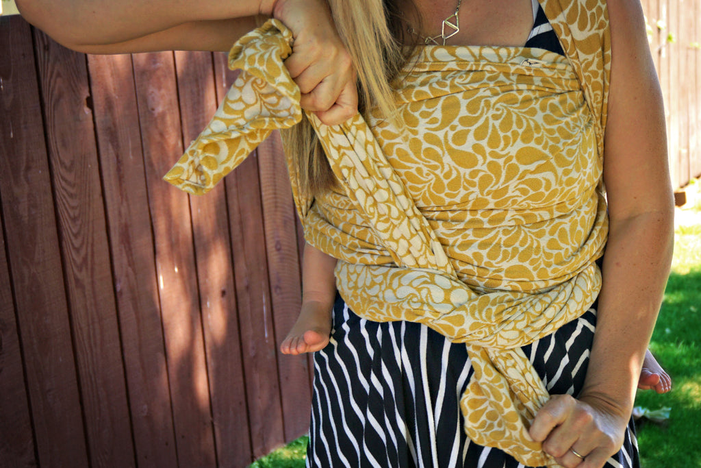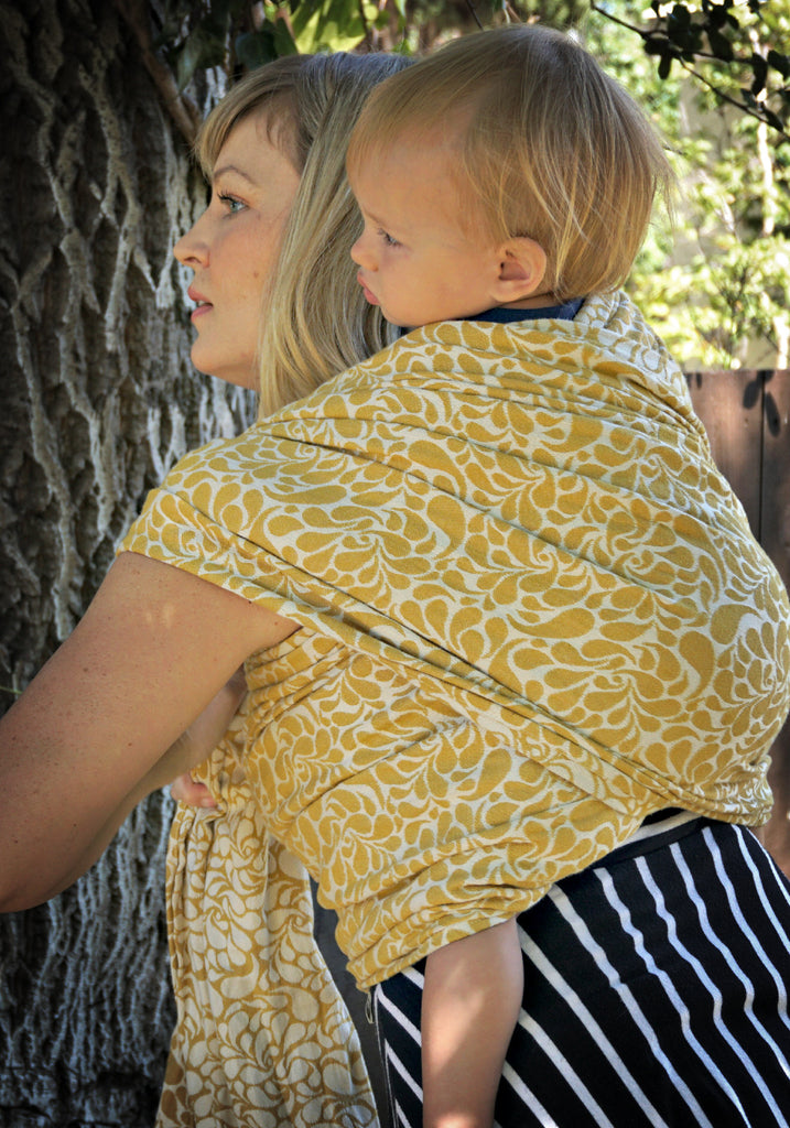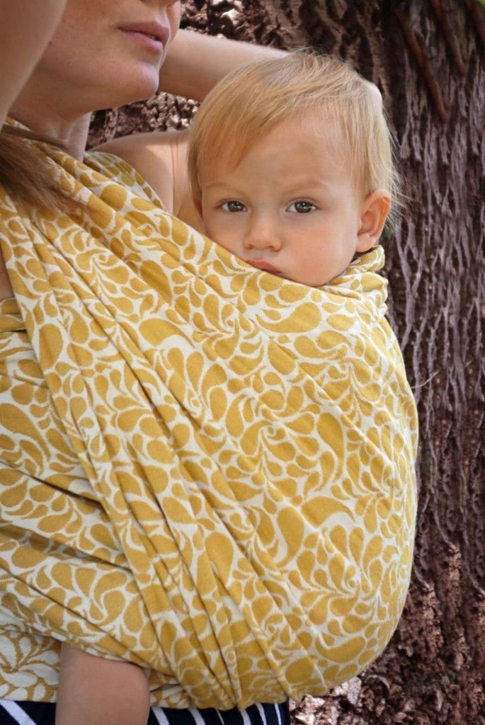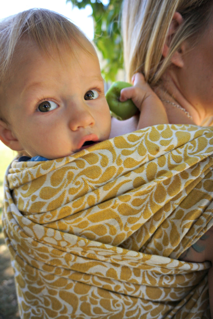 It is medium weight in hand with a perfect drape, molding to your body after just one wash and iron. It breaks in easily and is a breeze to wrap with for both new and experienced wrappers. Passes glide easily with the perfect amount of grip to lock into place. It has bounce with no sag, while presenting significant cush for your shoulders, making it an ideal squish-to-toddler wrap. It is the perfect addition to any stash.
