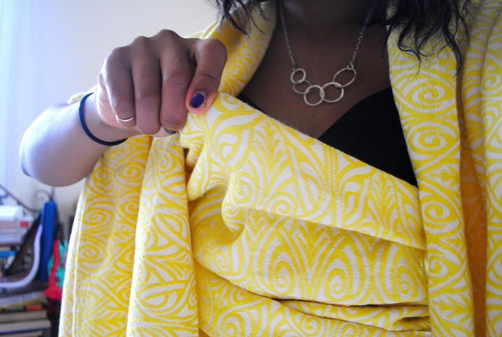 A heavier wrap, it is medium thick yet yielding for a cushy, moldable wrap job with bounce. Capella will snuggle your little one and your toddler with great results and wonderful cush on your shouldered.
